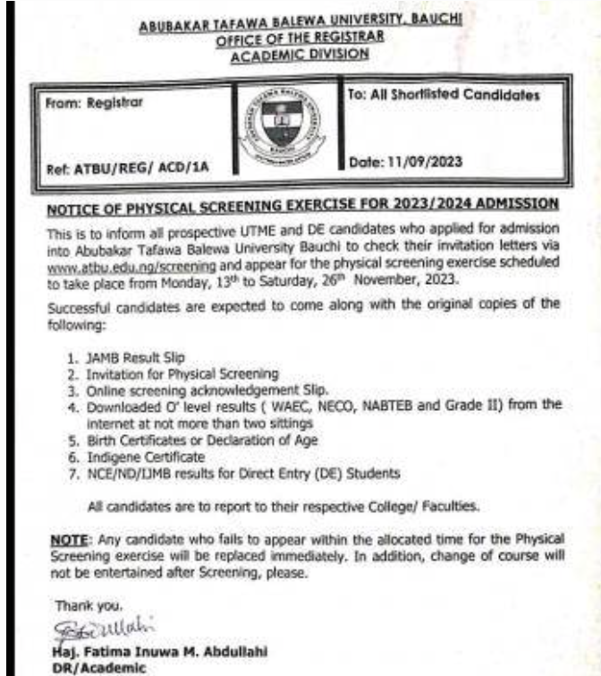 This is to inform all prospective UTME and DE candidates who applied for admission into Abubakar Tafawa Balewa University Bauchi to check their invitation letters via www.atbu.edu.ng/ screening and appear for the physical screening exercise scheduled to take place from Monday, 13th to Saturday, 26th November, 2023.