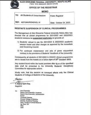 The Management of Alex Ekwueme Federal University Ndufu-Alike has directed that all clinical programmes for 2021/2022 and 2022/2023 academic sessions be suspended indefinitely on grounds of;
