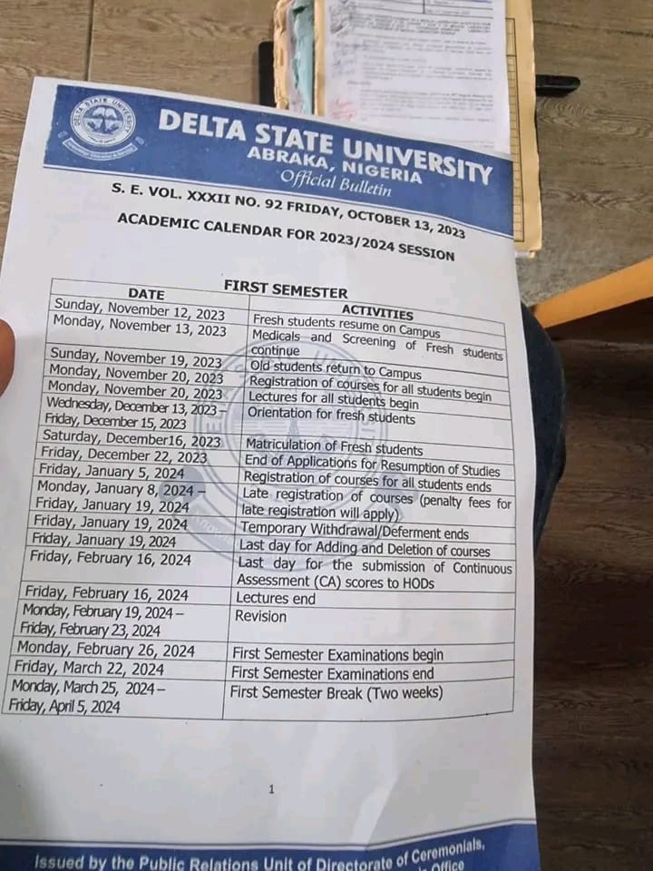 The management of Delta State University,Abraka has released the academic calendar for the 2023/24 academic session.