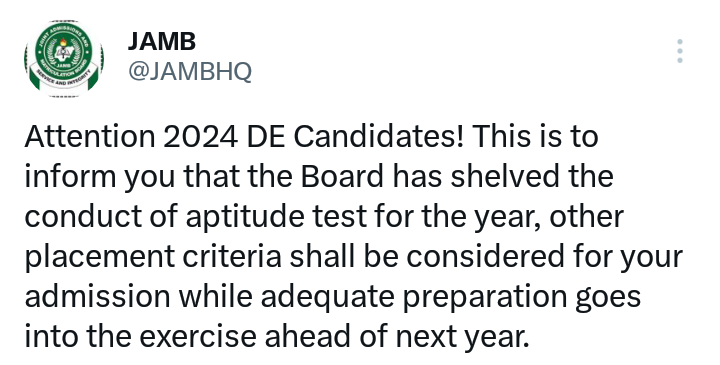 This is to inform you that the Board has shelved the conduct of aptitude test for the year.