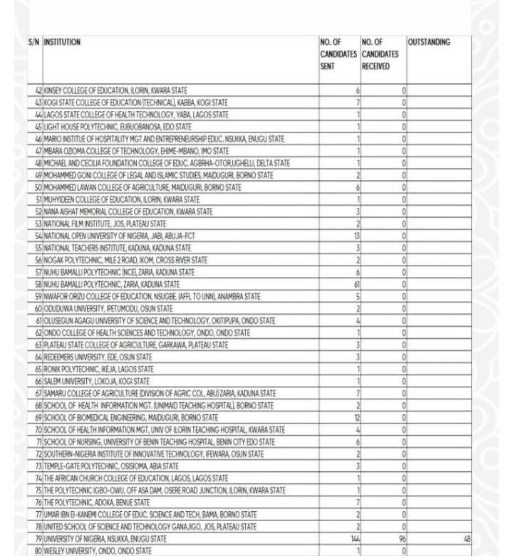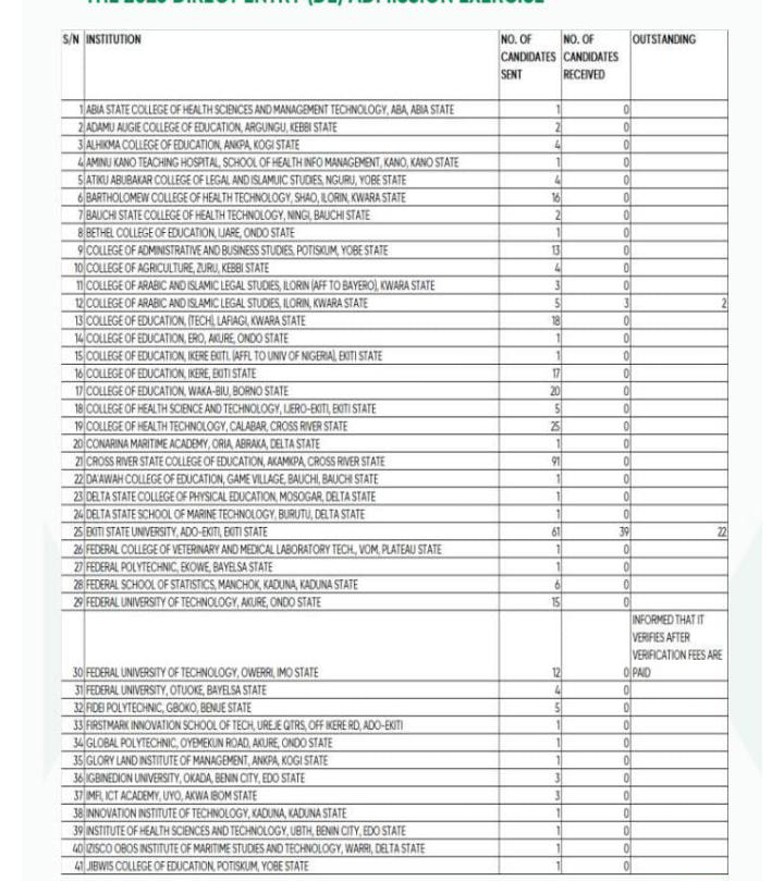 The Joint Admissions and Matriculation Board (JAMB) has released an official list of educational institutions that are yet to verify their candidates for the 2023 Direct Entry (DE) admission process.