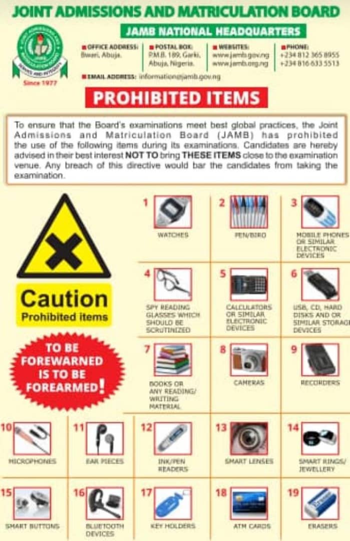 JAMB RELEASES LIST OF PROHIBITED MATERIALS AGAINST COMMENCEMENT OF 2024 EXAMINATION April 15, 2024 by Abdullah Sulaiman Alabi Advertisements Related Related posts: HOW TO GET ADMISSION TO OXFORD UNIVERSITY LIST OF SCHOOLS WHOSE POST UTME FORMS ARE ON SALES FOR 2023/2024 LIST OF SCHOOLS WHOSE POST UTME FORMS ARE ON SALES FOR 2023/2024 NNPC, SEPLAT 2024 UNDERGRADUATE SCHOLARSHIP PROGRAMME 2024 Fully Funded Scholarship: Beijing Institute of Technology Scholarship for International Students to Study in China ALSO READ STRIKE: ASUU THREATENS FRESH STRIKE, ISSUES ULTIMATUM TO FG