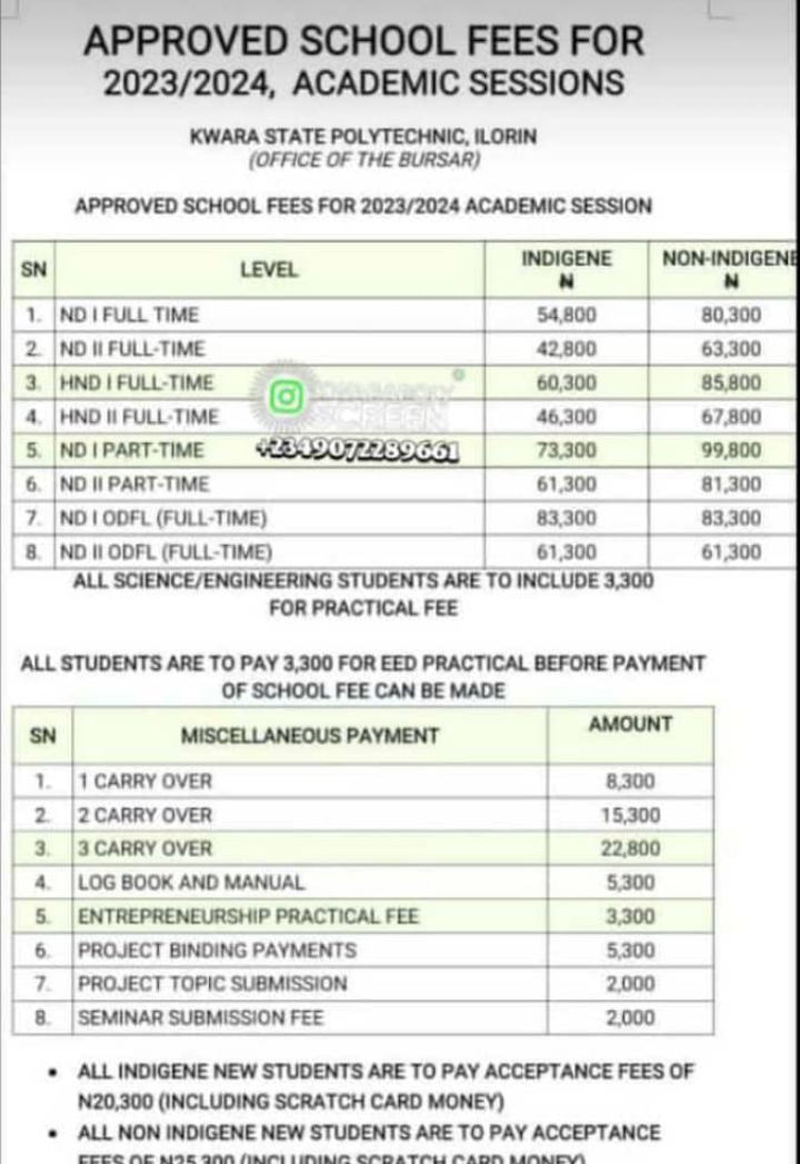 KWARAPOLY RELEASES APPROVED TUITION FEES FOR 2023/2024 ACADEMIC SESSION November 16, 2023 by Abdullah Sulaiman Alabi Related Related posts: HOW TO GET ADMISSION TO OXFORD UNIVERSITY LIST OF SCHOOLS WHOSE POST UTME FORMS ARE ON SALES FOR 2023/2024 LIST OF SCHOOLS WHOSE POST UTME FORMS ARE ON SALES FOR 2023/2024 NNPC, SEPLAT 2024 UNDERGRADUATE SCHOLARSHIP PROGRAMME 2024 Fully Funded Scholarship: Beijing Institute of Technology Scholarship for International Students to Study in China ALSO READ KWARA POLYTECHNIC DIRECTS STUDENTS TO PAY COMPULSORY MEDICAL FEE