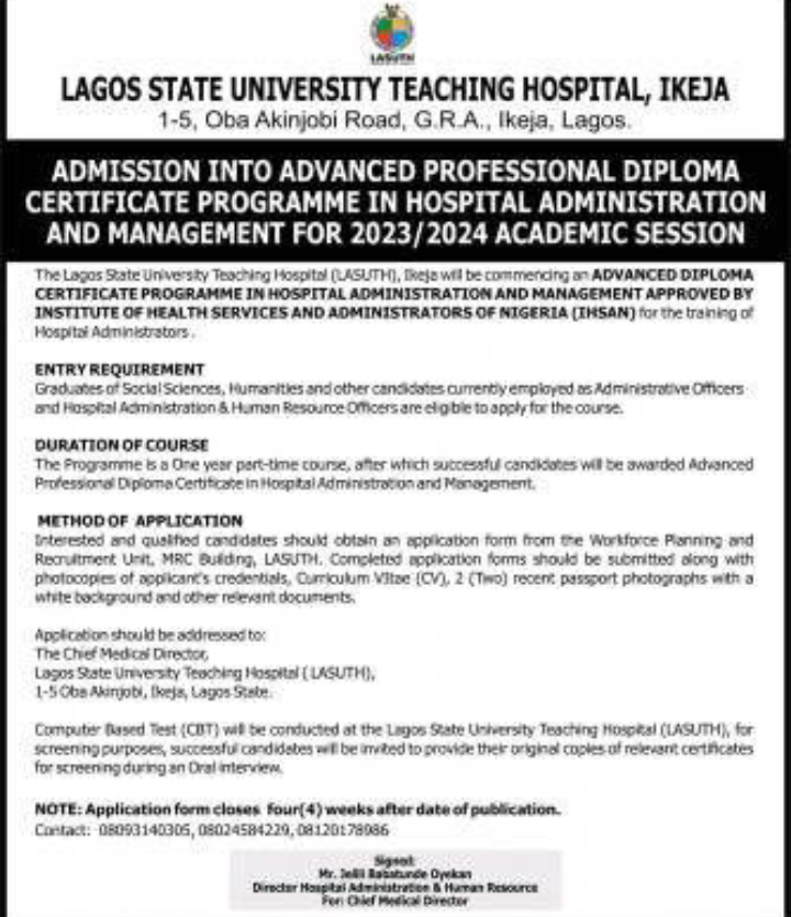 The Lagos State University Teaching Hospital (LASUTH), Ikeja will be commencing an ADVANCED DIPLOMA CERTIFICATE PROGRAMME IN HOSPITAL ADMINISTRATION AND MANAGEMENT APPROVED BY INSTITUTE OF HEALTH SERVICES AND ADMINISTRATORS OF NIGERIA (IHSAN) for the training of Hospital Administrators.