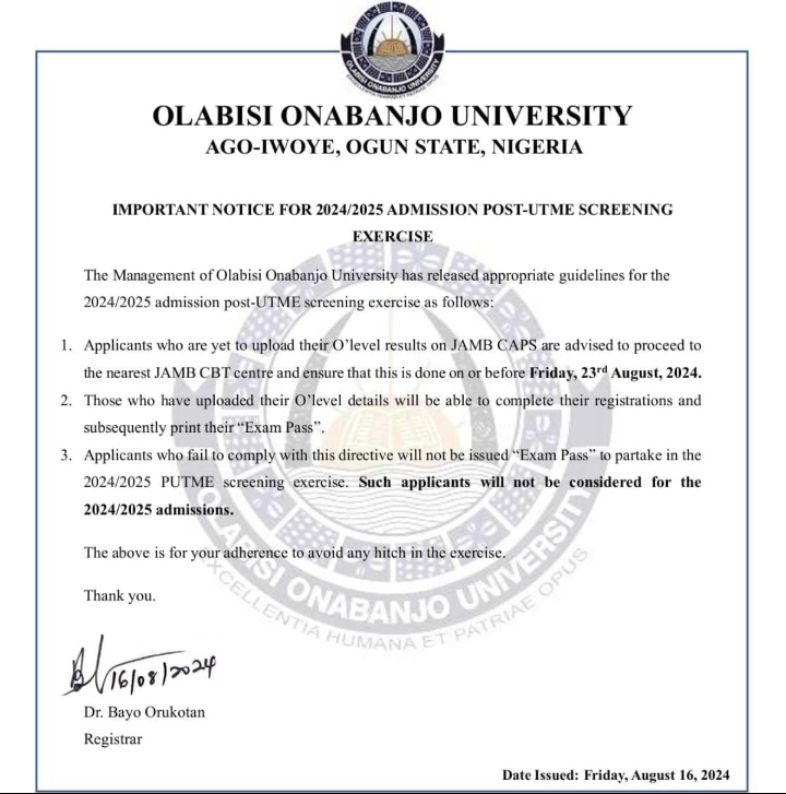 OOU ISSUES IMPORTANT NOTICE FOR 2024/2025 ADMISSION SCREENING EXERCISES August 16, 2024 by Abdullah Sulaiman Alabi Advertisements Related Related posts: HOW TO GET ADMISSION TO OXFORD UNIVERSITY LIST OF SCHOOLS WHOSE POST UTME FORMS ARE ON SALES FOR 2023/2024 LIST OF SCHOOLS WHOSE POST UTME FORMS ARE ON SALES FOR 2023/2024 NNPC, SEPLAT 2024 UNDERGRADUATE SCHOLARSHIP PROGRAMME 2024 Fully Funded Scholarship: Beijing Institute of Technology Scholarship for International Students to Study in China ALSO READ UNIVERSITY OF MEDICAL SCIENCES, ONDO RELEASES PREDEGREE ADMISSION FORM FOR 2024/2025 ACADEMIC SESSION