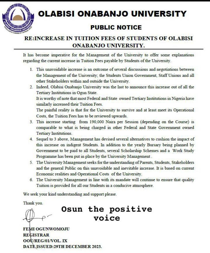 OOU ISSUES NOTICE TO STUDENTS ON FEES INCREMENT December 31, 2023 by Abdullah Sulaiman Alabi Advertisements Related Related posts: HOW TO GET ADMISSION TO OXFORD UNIVERSITY LIST OF SCHOOLS WHOSE POST UTME FORMS ARE ON SALES FOR 2023/2024 LIST OF SCHOOLS WHOSE POST UTME FORMS ARE ON SALES FOR 2023/2024 NNPC, SEPLAT 2024 UNDERGRADUATE SCHOLARSHIP PROGRAMME 2024 Fully Funded Scholarship: Beijing Institute of Technology Scholarship for International Students to Study in China ALSO READ ADEKUNLE AJASIN UNIVERSITY AKUNGBA AKOKO, RELEASES 2024/2025 ADMISSION FORM