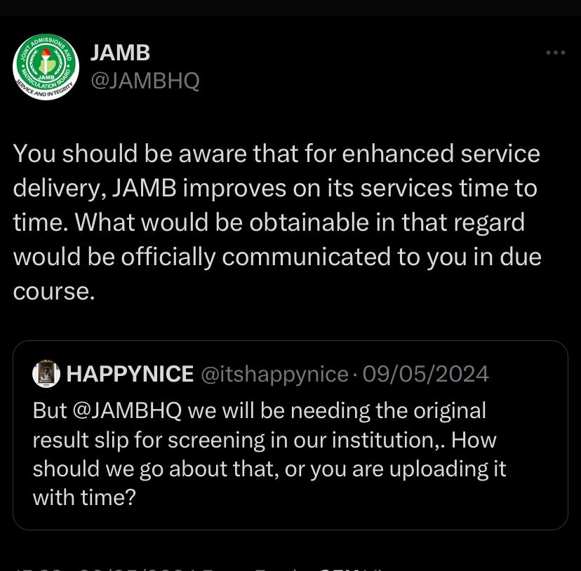“But JAMB, we will be needing the original result slip for screening in our institution,. How should we go about that, or you are uploading it with time?”