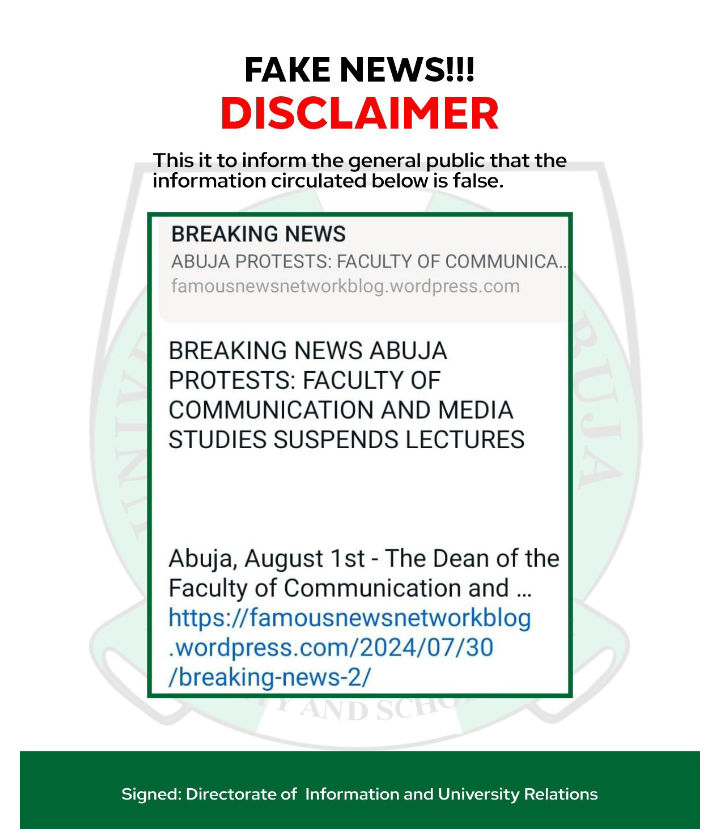 This is to inform the general public about the news circulating regarding the University of Abuja (UniAbuja). The news published on the site on the the memo below, claiming that the faculty of Communication and Media studies has suspended lectures, is false. Lectures were not suspended, and the public should disregard the news.
