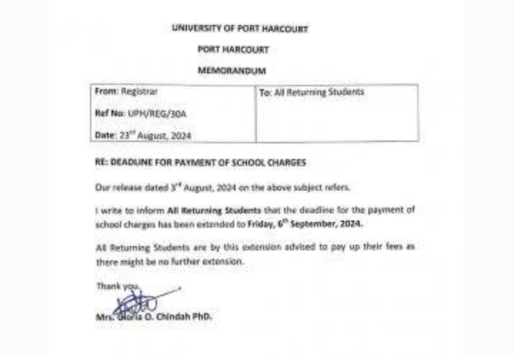 UNIPORT EXTENDS PAYMENT OF SCHOOL FEES DEADLINE FOR RETURNING STUDENTS August 24, 2024 by Abdullah Sulaiman Alabi Advertisements Related Related posts: HOW TO GET ADMISSION TO OXFORD UNIVERSITY LIST OF SCHOOLS WHOSE POST UTME FORMS ARE ON SALES FOR 2023/2024 LIST OF SCHOOLS WHOSE POST UTME FORMS ARE ON SALES FOR 2023/2024 NNPC, SEPLAT 2024 UNDERGRADUATE SCHOLARSHIP PROGRAMME 2024 Fully Funded Scholarship: Beijing Institute of Technology Scholarship for International Students to Study in China ALSO READ BUK RELEASES CUTOFF MARK FOR 2024/2025 ACADEMIC SESSION