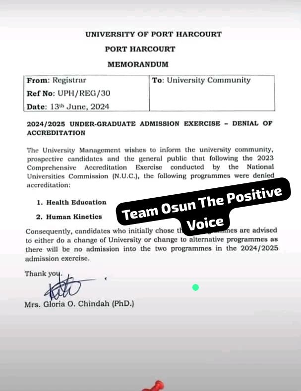 This is to inform 2024/2025 Uniport applicants who have chosen Health Education or Human Kinetics as their course to either change their institution or switch to another course, as these two courses were denied accreditation by the N.U.C.